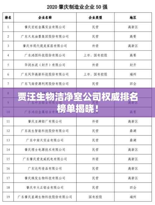 随着生物科技领域的飞速发展,洁净室技术在生物产业中的应用愈发重要,贾汪地区作为生物洁净室技术的先行区域之一,涌现出了一批具有影响力的生物洁净室公司,本文将为您详细介绍贾汪生物洁净室公司的排名及相关情况。