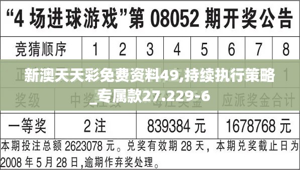 在“新澳天天彩免费资料49”的热潮中,每一个策略的持续执行都显得尤为关键。为何策略如此重要?因为在这个看似随机的数字游戏中,真正能够让投资者脱颖而出的是那一份源于数字规律和市场变化的深刻理解。对于广大彩民来说,研究并执行一个有效的策略不仅是赢得大额奖金的制胜法宝,更是在复杂多变的彩票市场中保持稳定心态和理性投资的必要条件。持续执行策略,意味着对“新澳天天彩免费资料49”的深入洞察和把握,这种持续的力量在时间的流逝中逐渐显现其价值,不断积累成为投资成功的坚实基石。
